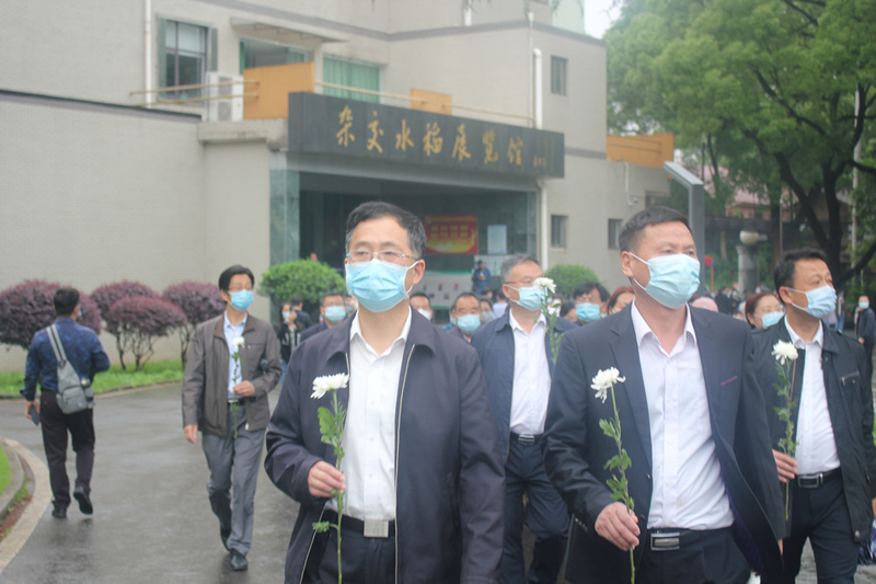 5月23日上午,我院党委书记胡佳武带队,带领由全体院级领导、教师代表、学生代表、优秀毕业生代表与离退休干部代表组成的25人代表团成员。从怀化出发,来到名誉院长袁隆平老师工作与居住过的湖南省杂交水稻研究中心,敬献鲜花,沉痛悼念袁隆平老师。