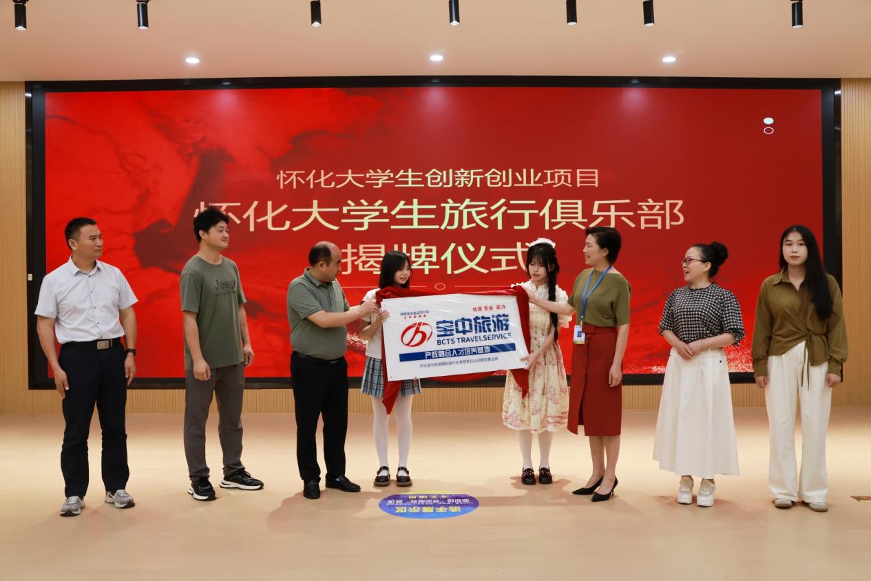 近日,我校大学生创新创业项目——怀化大学生旅行俱乐部揭牌成立。怀化市旅游协会会长、怀化宝中旅游国际旅行社董事长杨金荣,学校党委委员、副校长廖冬云出席揭牌仪式。商贸旅游学院负责人、创新创业师生团队和2024级旅游管理专业全体学生参加。